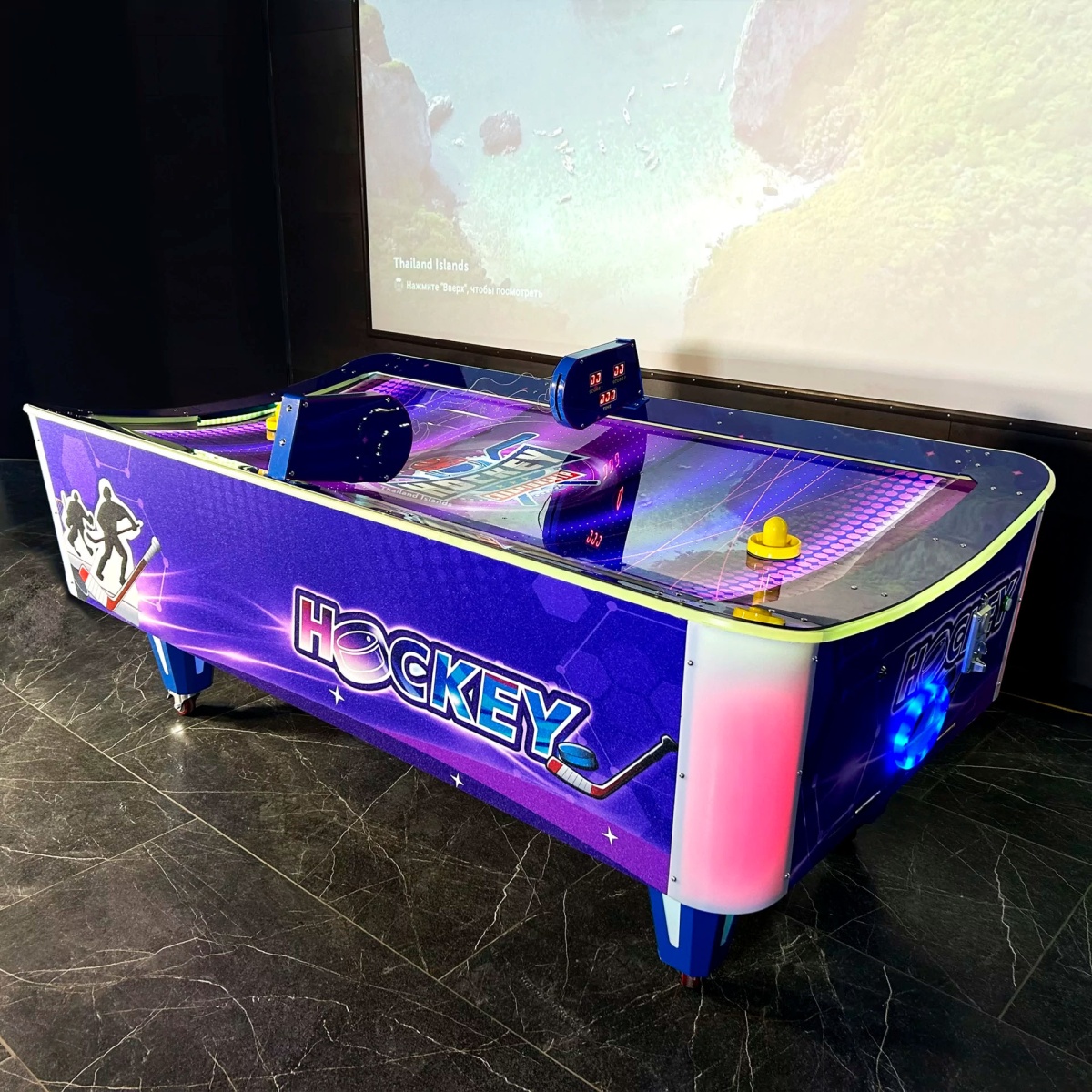 Отличное вложение для бизнеса: Этот аэрохоккей - отличное решение для вашего развлекательного центра или игровой комнаты. Его стильный дизайн с изогнутой поверхностью придает игре современный вид, а прочный корпус обеспечивает долгий срок службы.