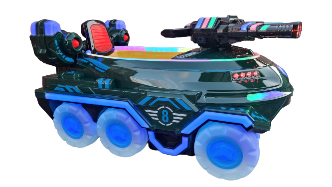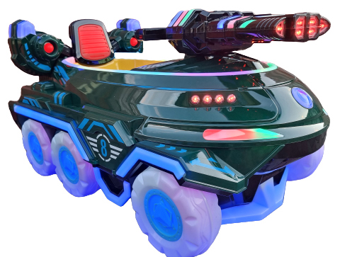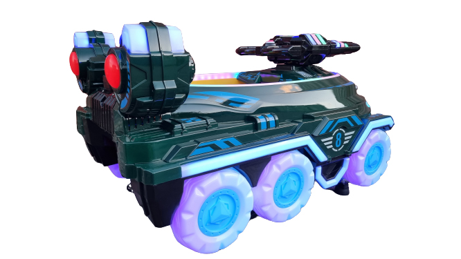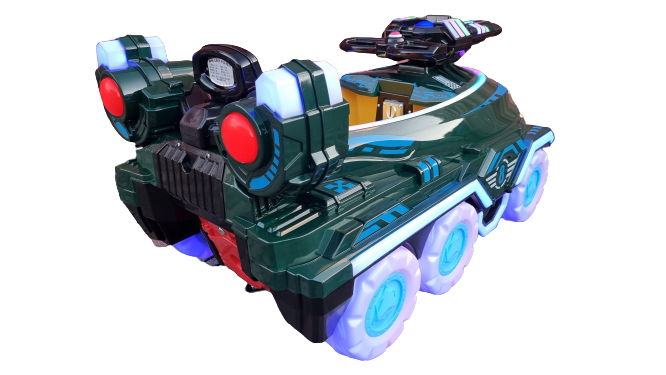 Аттракцион качалка "Боевая машинка" оснащен красочной подсветкой, музыкальной системой с возможностью проигрывать разнообразные детские песни.