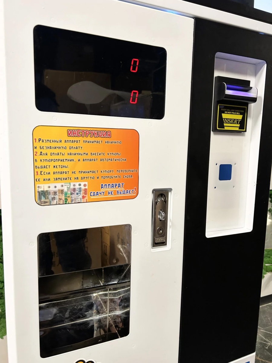 В стандартной комплектации разменный автомат оборудован купюроприемником, а также имеет возможность установки монетоприемника или терминала для безналичной оплаты. Простота использования - вот основной характеристикой этого устройства. Задавая стоимость жетона, посетители вносят оплату и моментально получают необходимые жетоны.